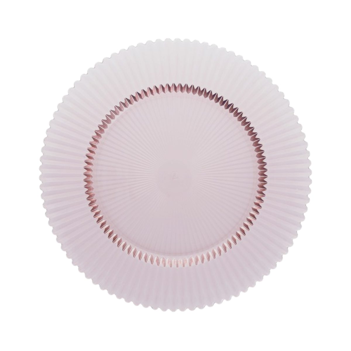 Glass charger plate with narrow ribbed texture around the rim and center of the plate